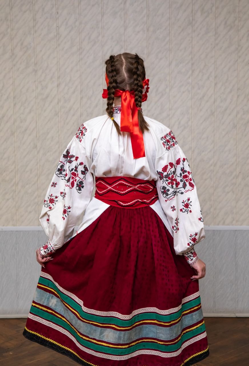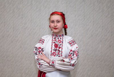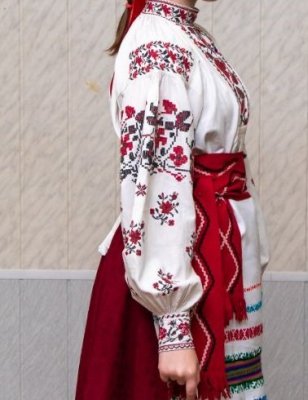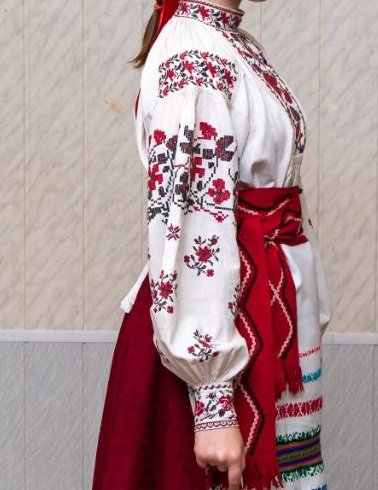 Сорочка виготовлена із білої бавовняної тканини, оздоблена рослинним орнаментом червоно-чорними нитками у техніці хрестик, горловина утворена за рахунок густих зборів стану та рукавів і зафіксована пришитим коміром-стійкою, з бічним розрізом застібається трьома пластмасовими ґудзиками на прорізні петлі, комір, пазушна планка, коміри та манжети оздоблені вишивкою, рукави прямі, закінчення рукавів призібране та пришите до манжетів, застібається на два пластмасові ґудзики дві прорізні та повітряні петлі.