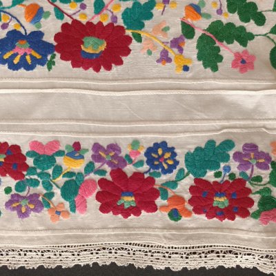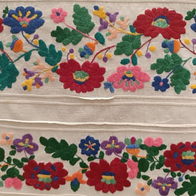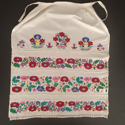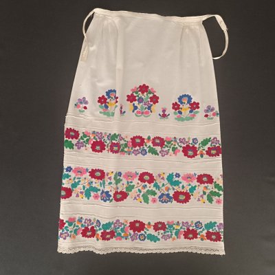 Цей святковий фартух є частиною традиційного жіночого строю Волині. Виготовлений із домотканого вибіленого полотна та оздоблений кольоровою вишивкою гладдю — технікою, характерною для регіону. Орнамент представлений у вигляді стилізованих квітів, що символізують жіночу вроду, життєдайну силу, любов і зв’язок з природою.