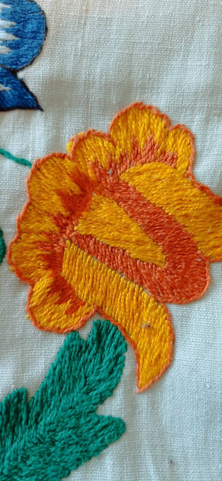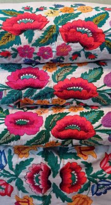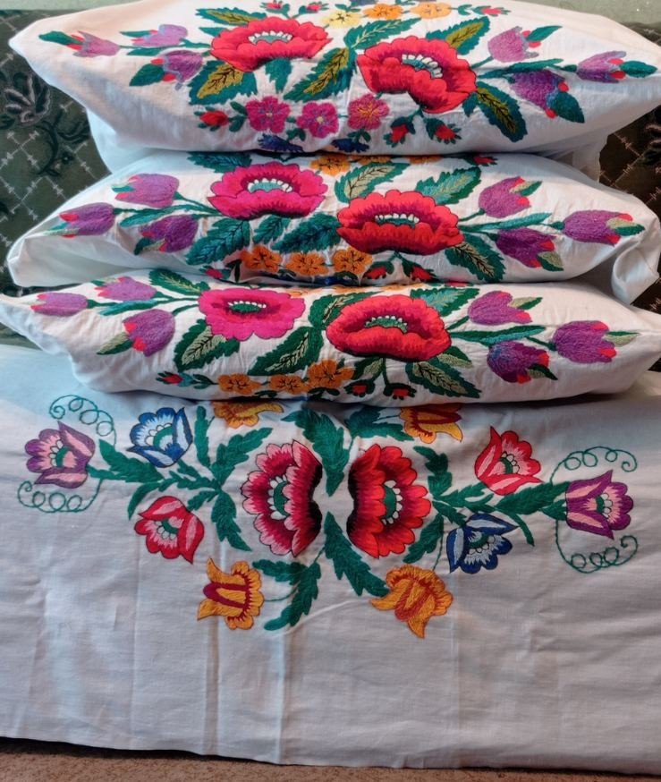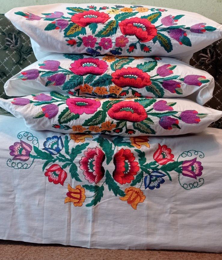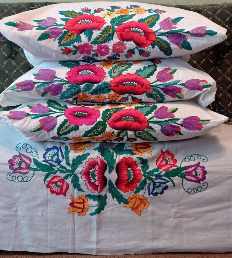 Простирадло та наволочки на подушки вишиті Кузьменко Марією Олексіївною з с. Заріччя Кролевецького району Сумської області. Було вишито на придане своїй онучці, як тій виповнився тільки рік, бо так було заведено вже з першого року життя дівчинки збирати придане.