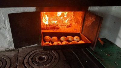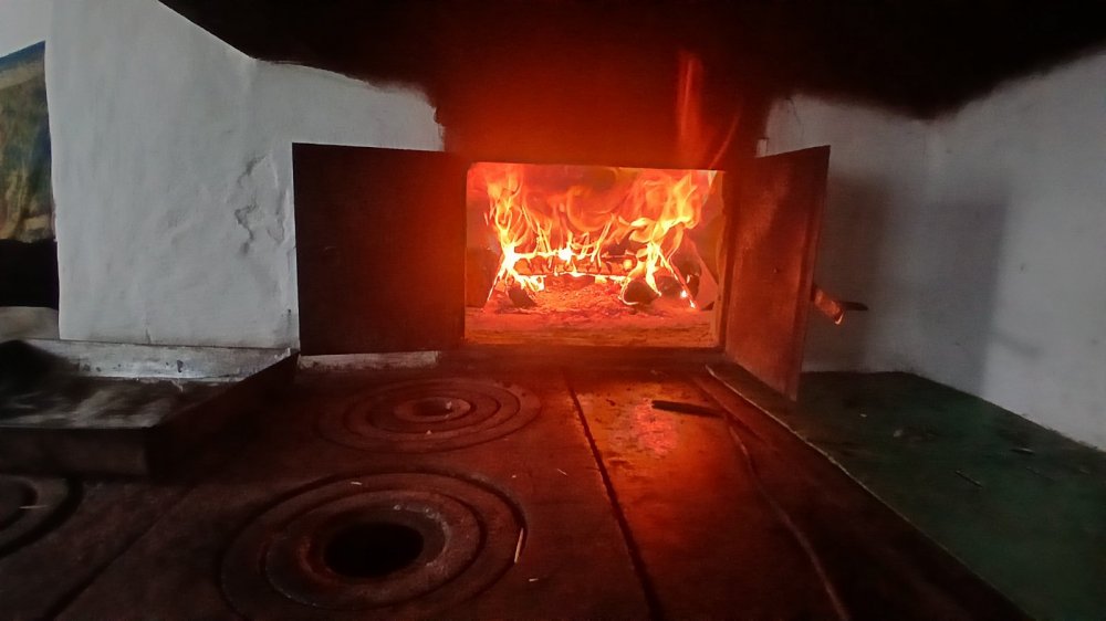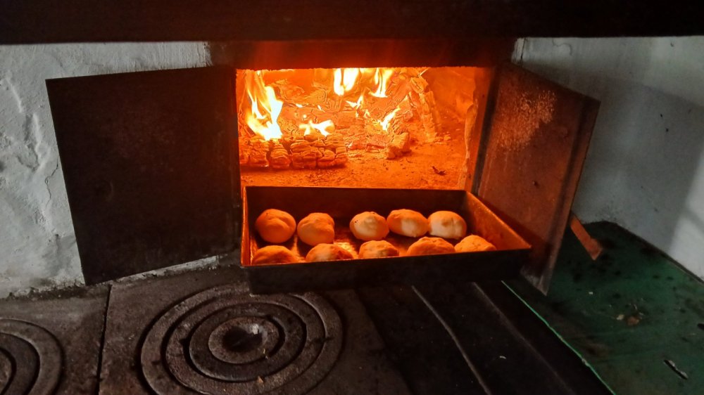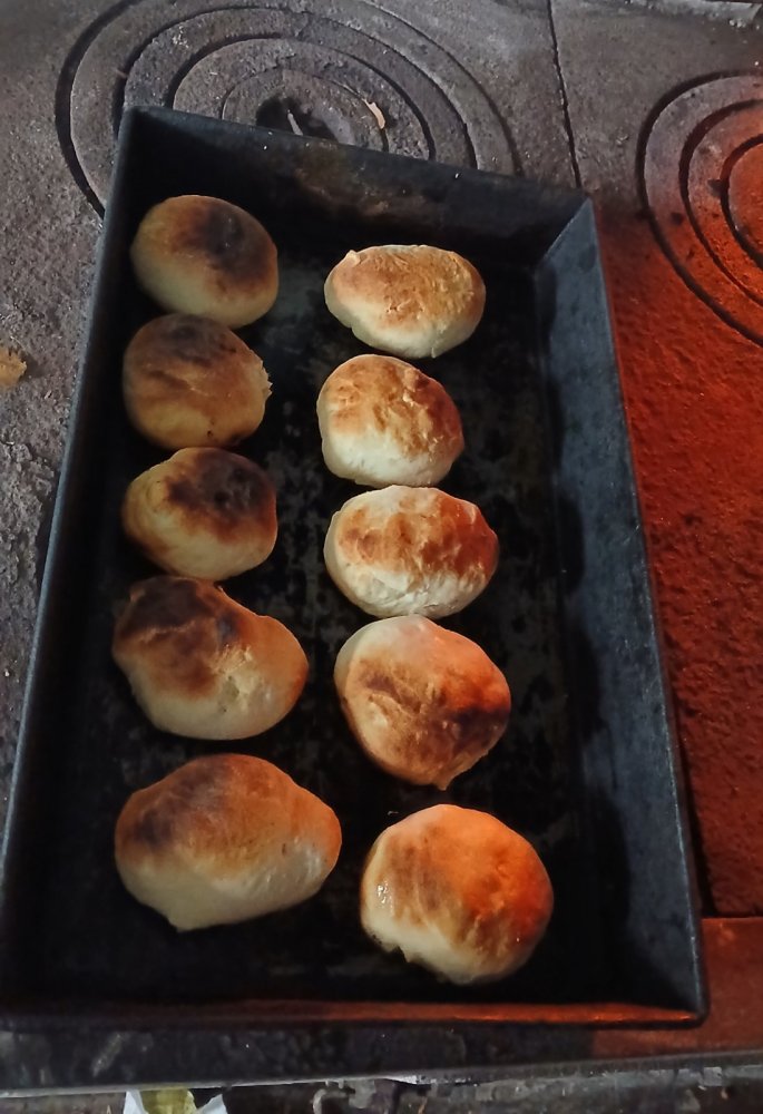 4. Коли полум'я розгорілося ставимо бляшку з шуликами перед піччю.