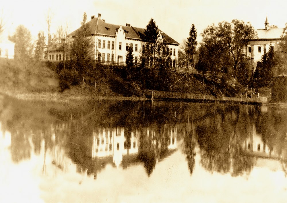 На задньому плані - Школа (побудована у 1906 році) і Костел (зруйнований у 1969 р.). Біля підніжжя - відпочинковий став.