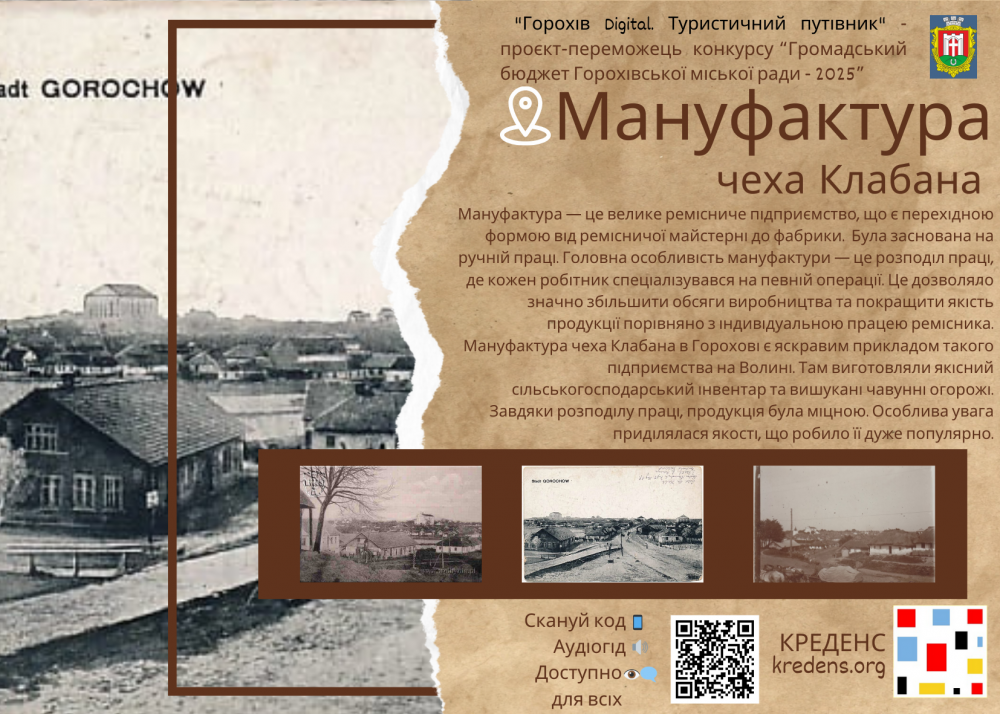Це місце відзначає важливу віху в економічному розвитку Горохова. Тут розташовувалася Мануфактура чеха Клабана — один із ключових промислових об'єктів міста.