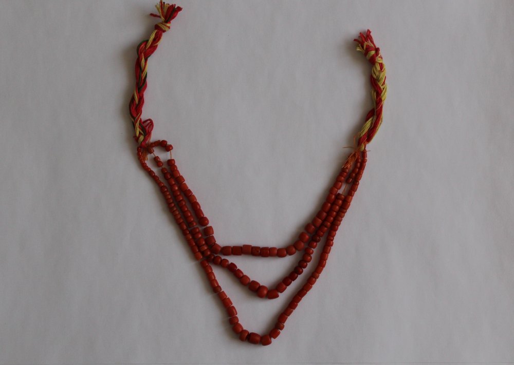Старовинне українське намисто з натурального червоного коралу, виконане у традиційній техніці. Прикраса складається з трьої низок коралових намистин різної форми та розміру, що характерно для автентичних виробів кінця ХІХ-початку ХХ століття. Низки з’єднані у верхній частині з плетеними нитками червоного, жовтого та зеленого кольорів.