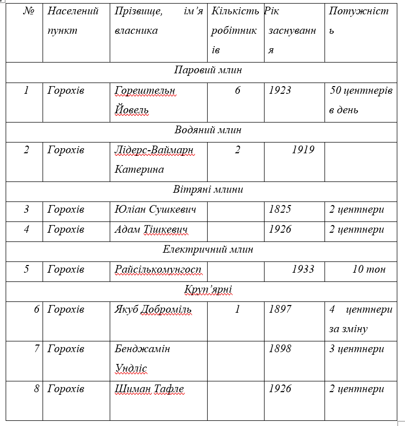 Таблиця зроблена на основі статті Чучман Мар’яни «Історія розвитку харчової промисловості Горохівщини», розміщеної в науковому збірнику «Минуле і сучасне Волині та Полісся: Рух опору тоталітарним і окупаційним режимам на теренах Волинської області». «Горохівщина в історії України та Волині». Матеріали ХХХІ Всеукраїнської науково-практичної історико-краєзнавчої конференції, Луцьк – Горохів, 14-15 травня 2009 р. – Луцьк, 2009. – 521 с., іл. ,ст. 90-91