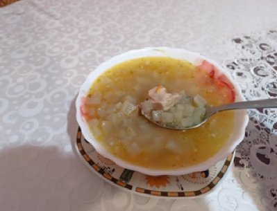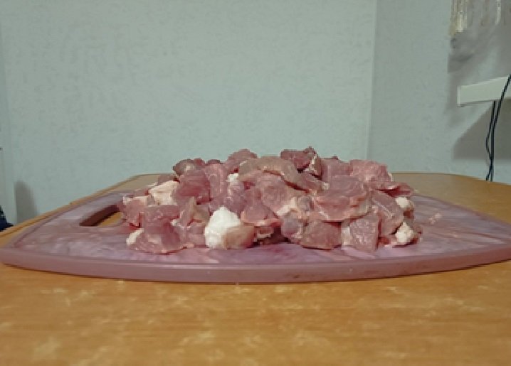 Для п’ятилітрової каструлі беремо один кілограм м’яса, нарізаного досить великими кубиками (приблизно 5×5 см). До м’яса додаємо чотири ребра або кілька кісток – вони нададуть бульйону особливої наваристості. Підійде будь-яке м’ясо: курятина, свинина чи яловичина.