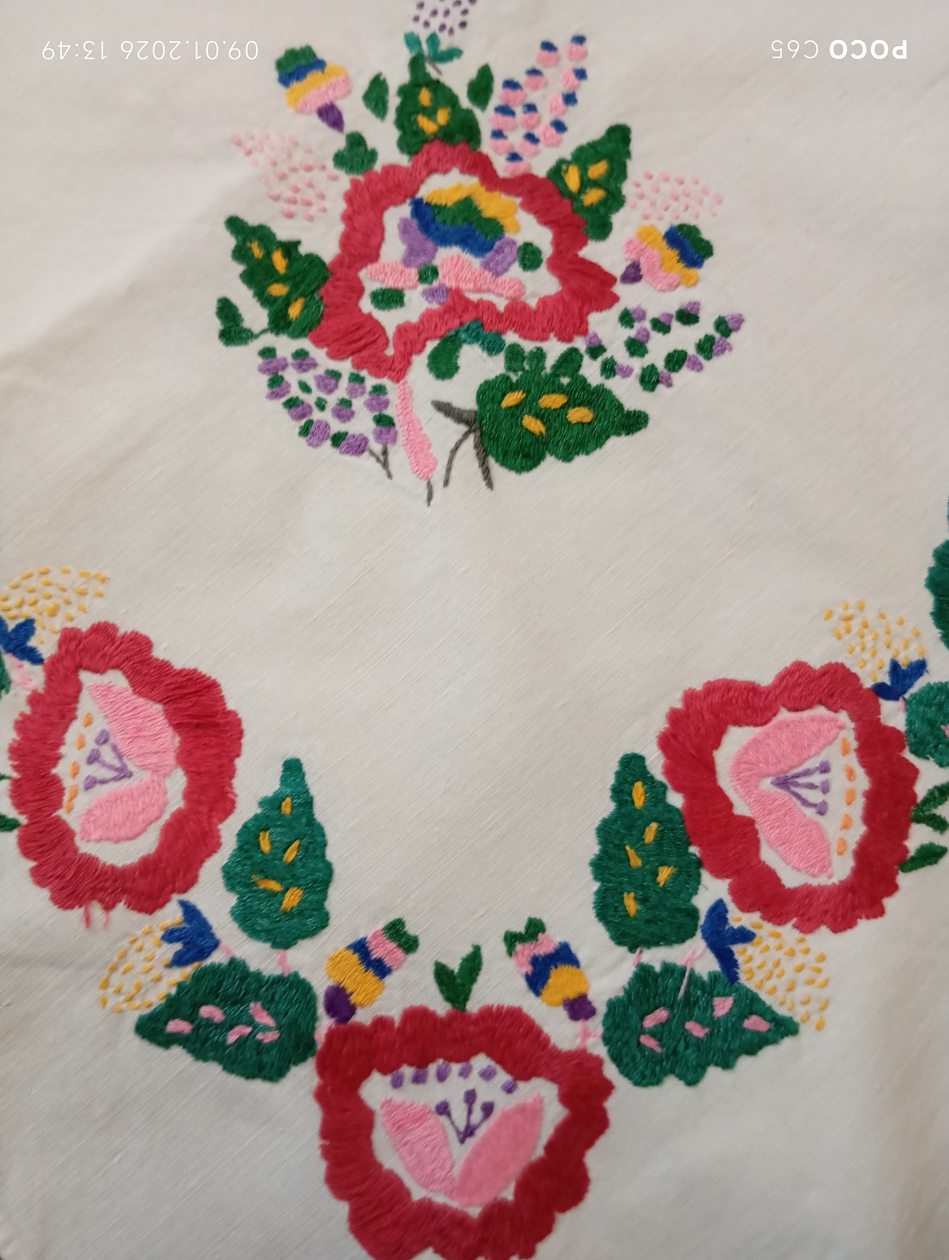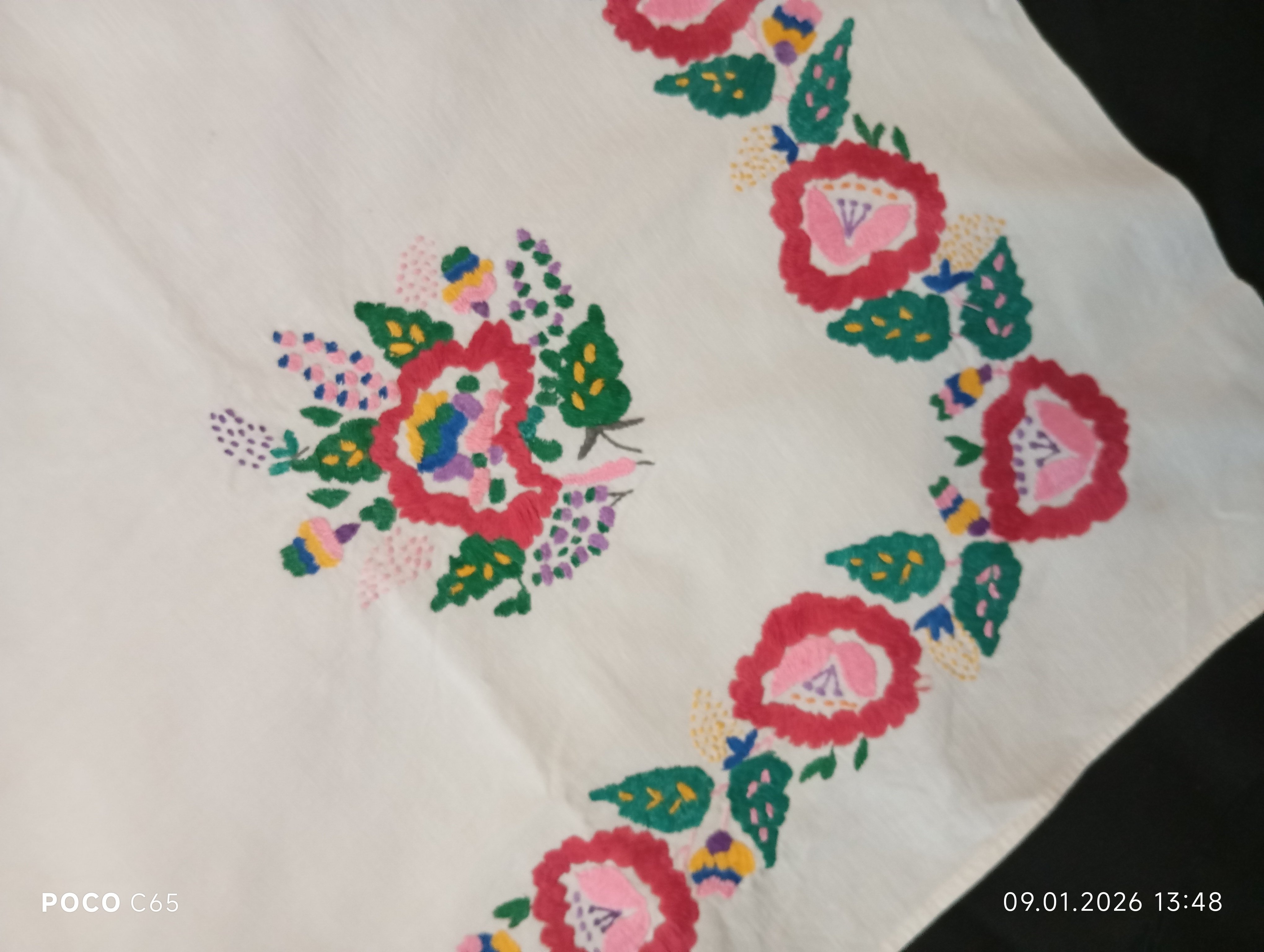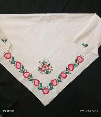 Хустка вишита гладдю на тканині перкаль. Це елемент святкового одягу, який одягали до церкви або на весілля. Вишита Терещук Ніною Михайлівною, 1944 року народження, жителькою села Деревок.
