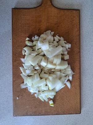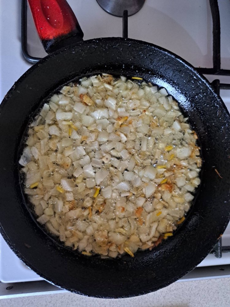 На пательні розігріти соняшникову олію. Додати цибулю та злегка підсмажити до прозорості.