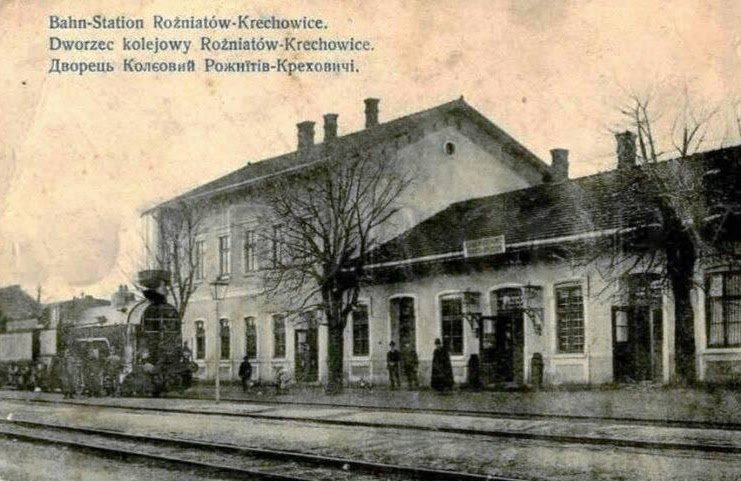 Залізнична станція Рожнятів. Відкрита у 1875 році при відкритті Залізниці Ерцгерцога Альбрехта, Стрий-Станиславів, як частини Трансверсальної широкої залізниці.