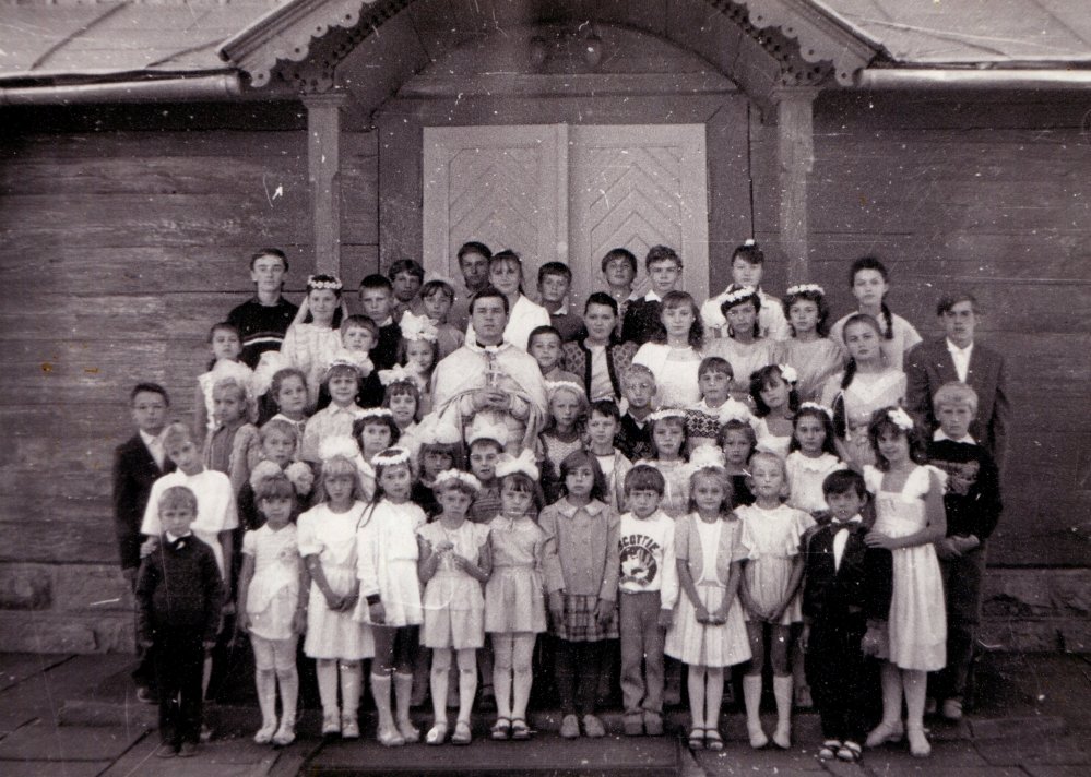Фото зафіксувало перше причастя дітей у Рожнятові у 1990 році - один із перших великих духовних моментів після відкриття церкви. Отець Олег Жовнірович благословляє наймолодших парафіян, для яких цей день став важливою подією в житті громади.