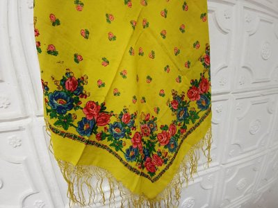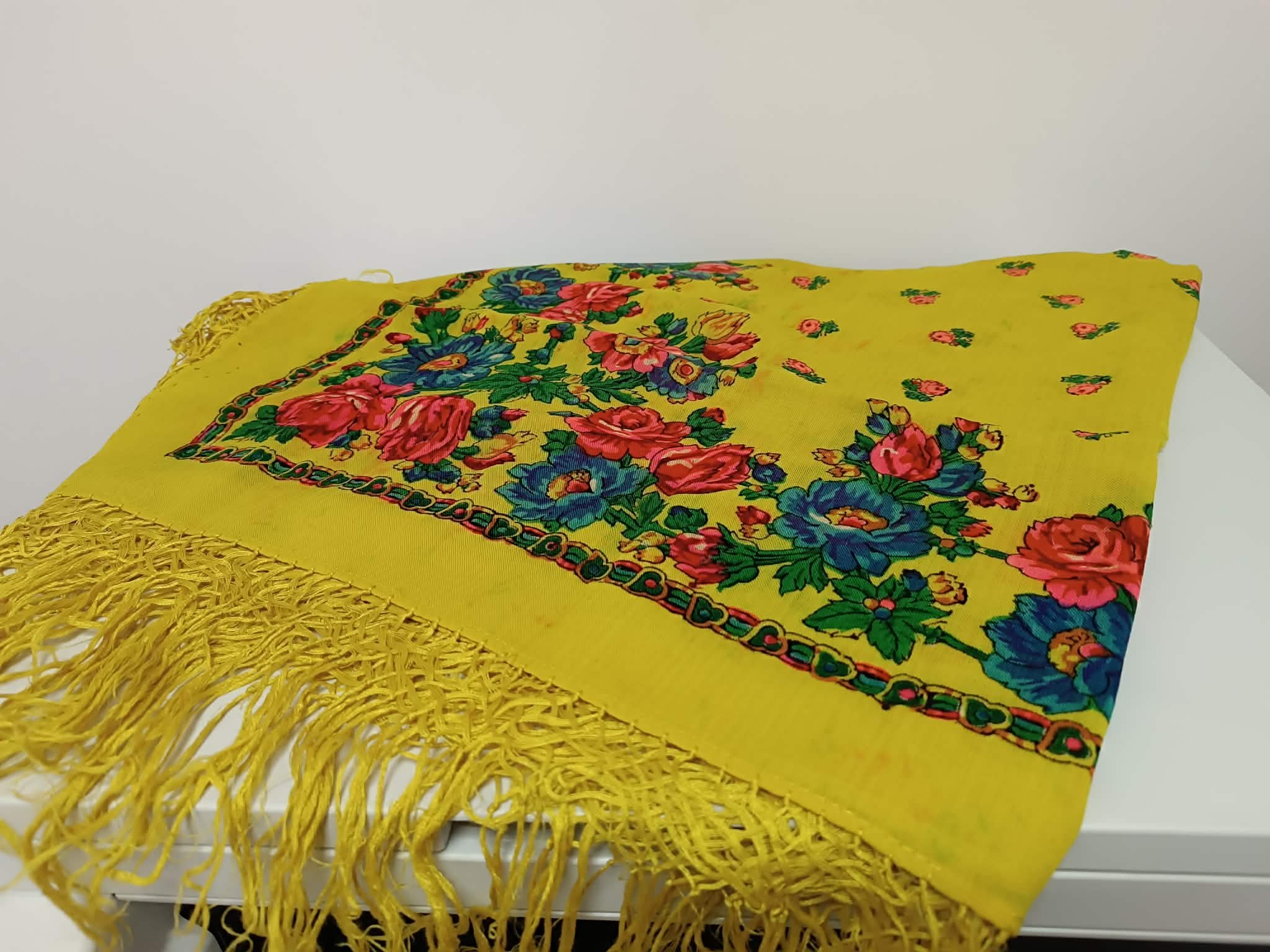 Подарована її чоловіком, Михайлом Дзямбою (1907 р. н.), у день весілля. Хустка виконана у жовтому кольорі, прикрашена яскравими квітковими візерунками, характерними для традиційних лемківських текстильних виробів. Така хустка слугувала не лише елементом святкового строю, а й мала символічне значення - була знаком пошани, любові та добробуту в новоствореній родині.