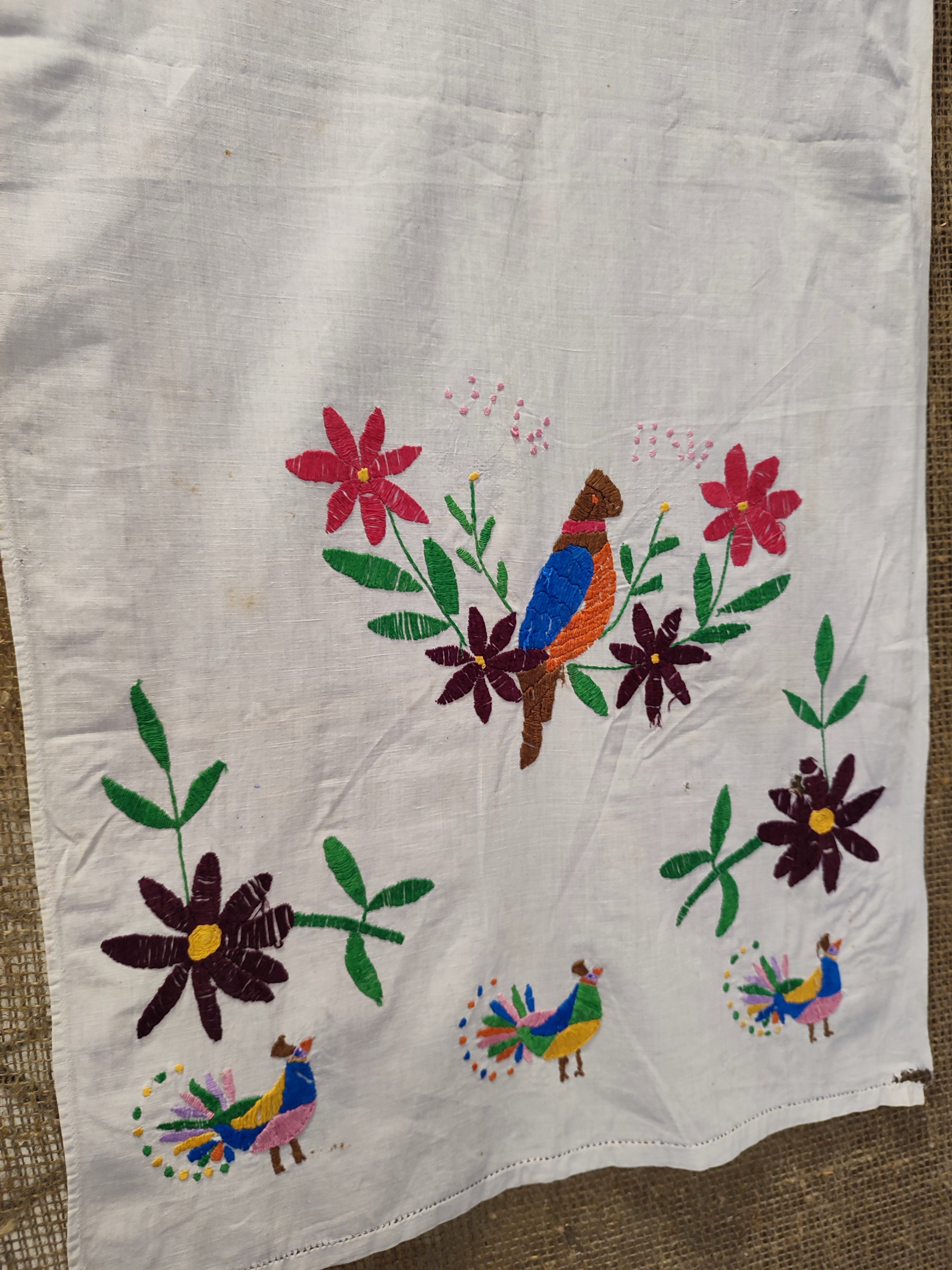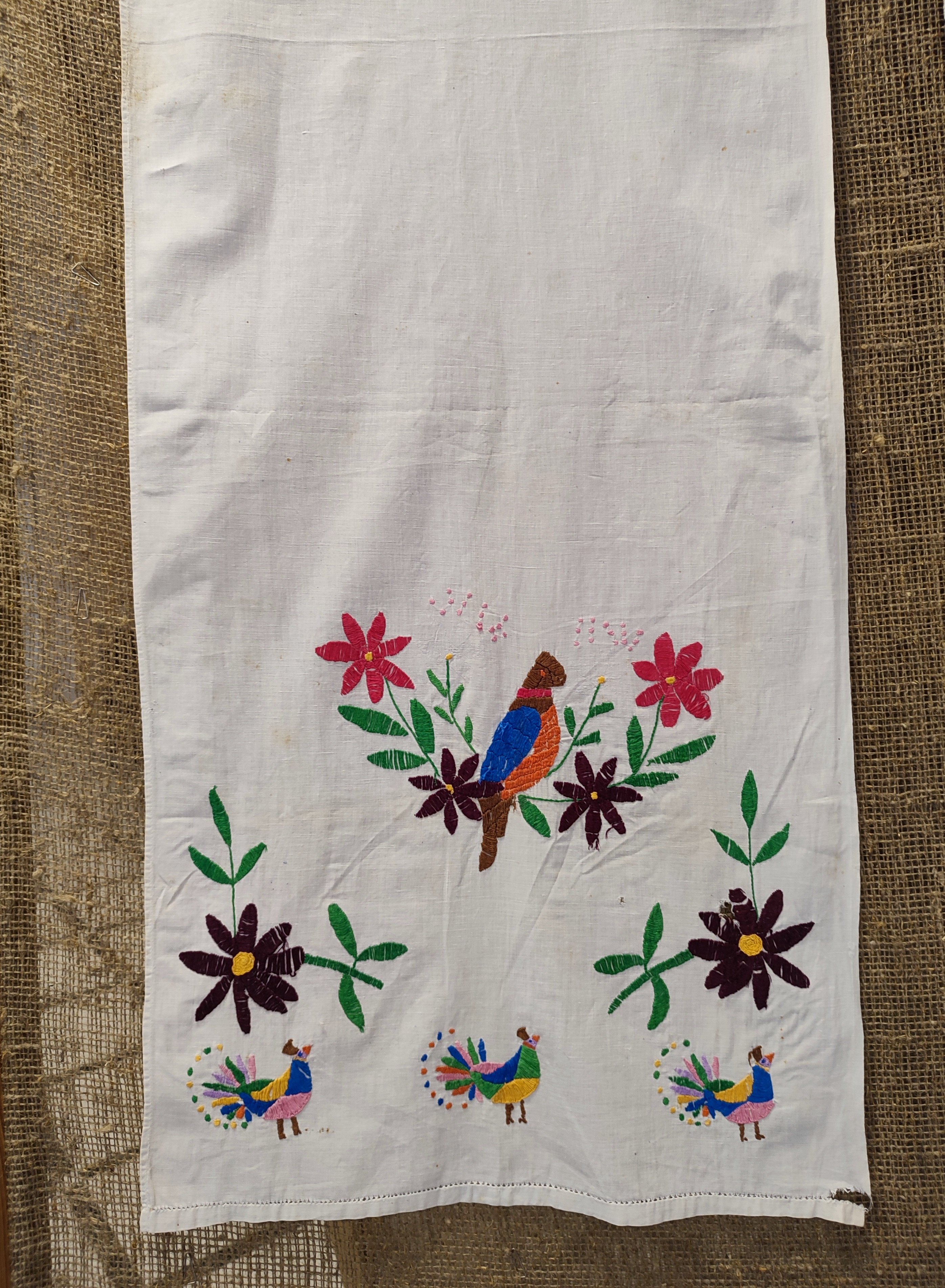 Рушник вишитий на тонкому перкалю, гдаддю, нитками муліне, поліхромна вишивка, рослинний та тваринний орнамент. Внизу є невелика мережка.