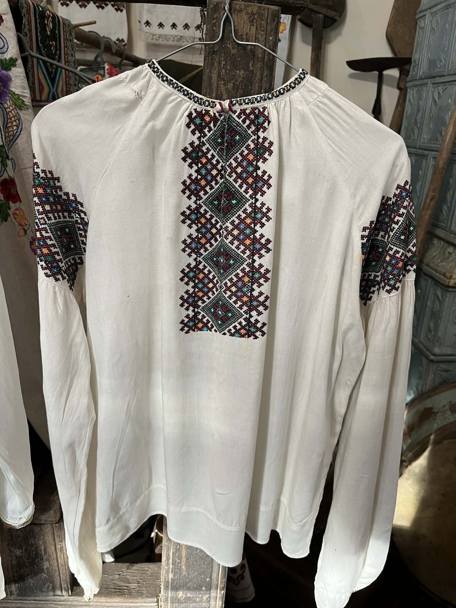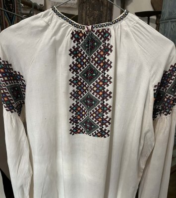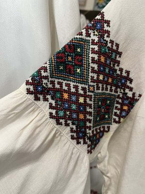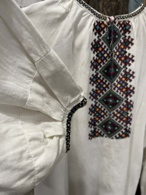 Бойківська жіноча сорочка початку ХХ століття, з домотканого тонкого білого полотна, оздоблена вишивкою, навколо горловини та на рукавах має багато дрібних складок, зшита вручну, техніка вишивки – хрестик.