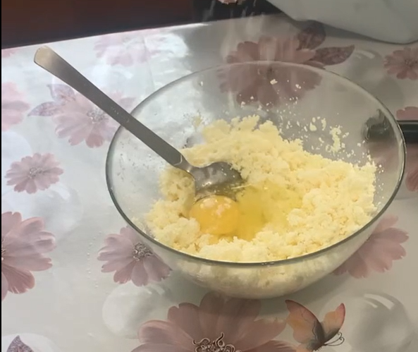 4. До кисломолочного сиру додати 2 яйця, сіль та спеції за смаком й також добре перемішати.