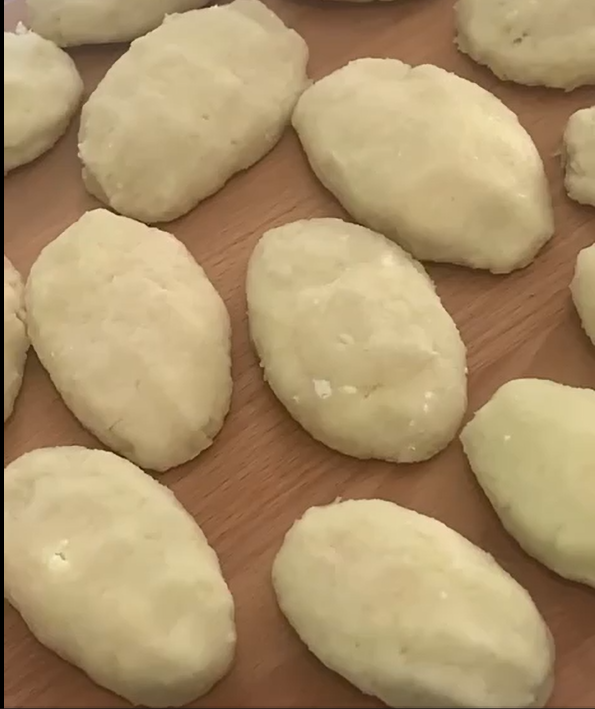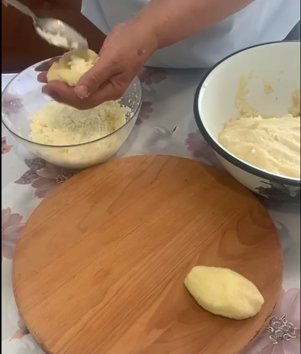 5. Руки змастіть олією або змочіть холодною водою. Від картопляного тіста відщипніть шматочок, зробіть коржик, покладіть начинку і сформуйте пиріжок, заліпивши краї.