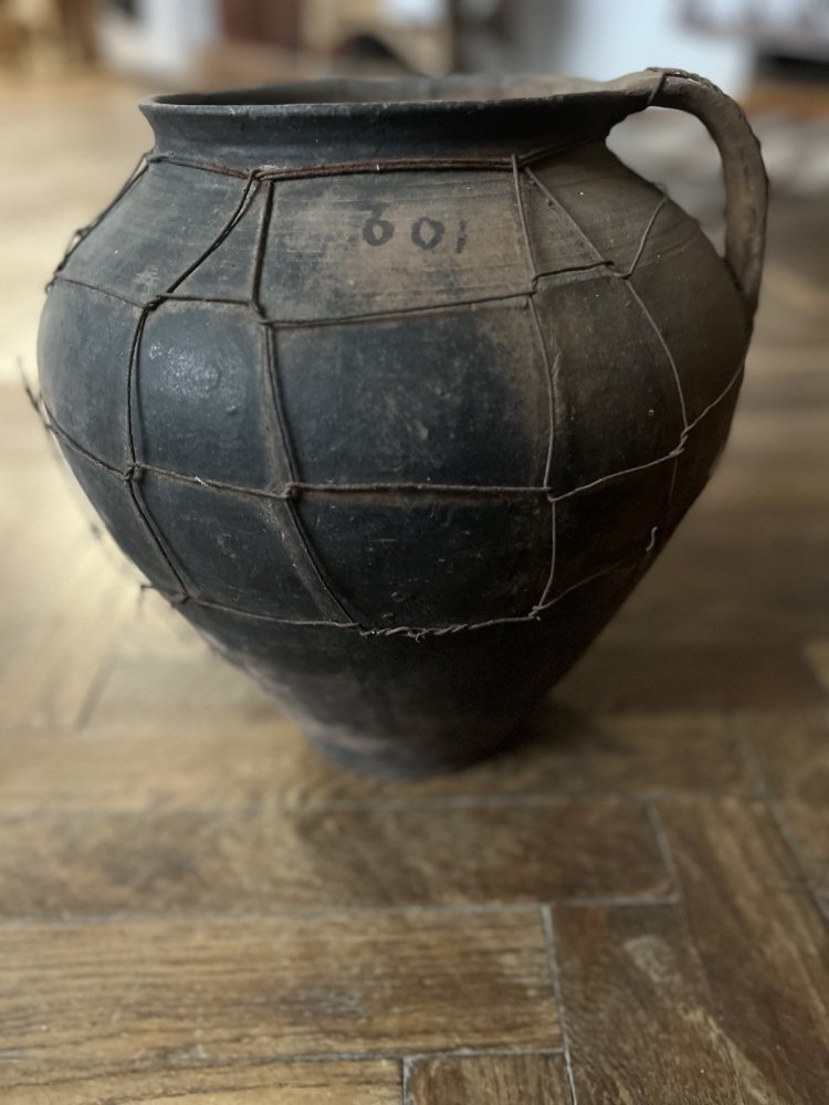 Горщик виготовлений з темненої (чорнолощеної або випаленої у безкисневому середовищі) глини, що надає йому характерного глибокого сірого-чорного відтінку. Має округле тулубне розширення та плавно звужене горлечко з невеликим вінчиком і міцною боковою ручкою.