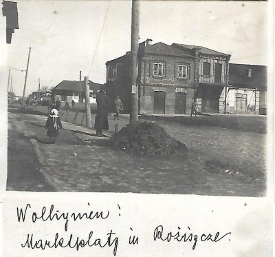 На фото — вулиця Володимирська та ринкова площа в Рожищі (це підтверджує і рукописний підпис внизу: “Wolhynien: Marktplatz in Rożyszcze”).