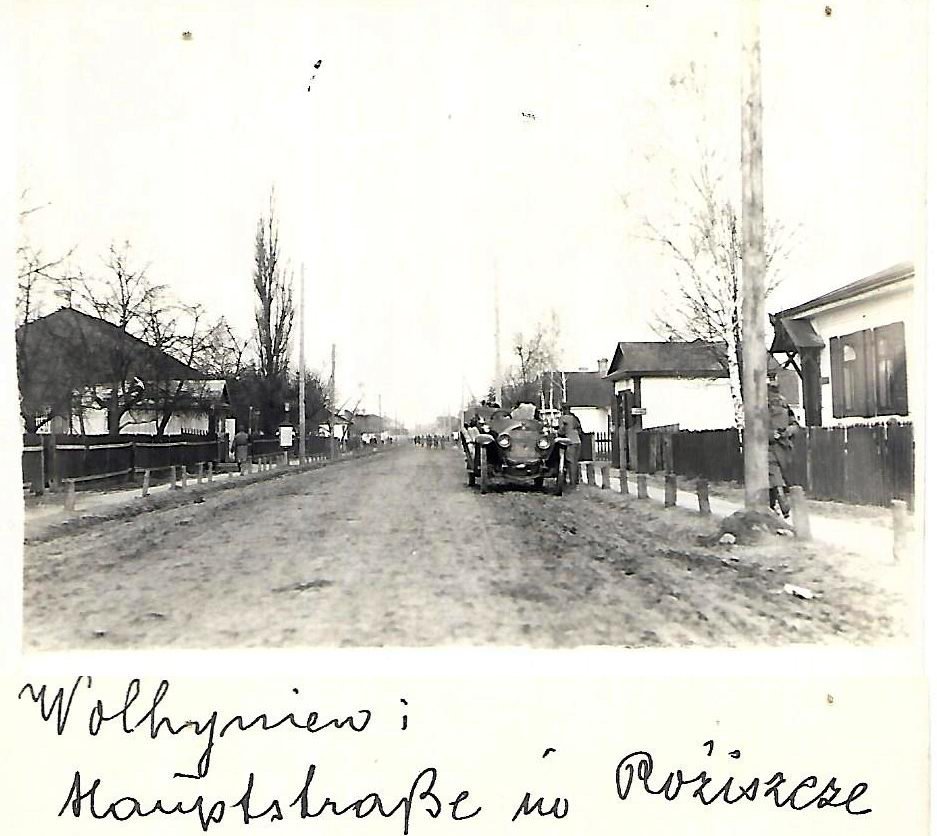 На чорно-білій фотографії зображено головну вулицю Рожища (це підтверджує рукописний підпис унизу: “Wolhynien: Hauptstraße in Rożyszcze” — «Волинь: головна вулиця в Рожищі»). Знімок датують, імовірно, міжвоєнним періодом.