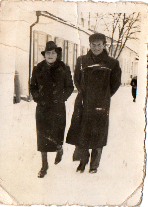 На фотографії зображено чоловіка (Борис Трофімчук) та жінку (Софія-Зенона Трофімчук), зафіксованих під час прогулянки зимовою міською вулицею міста Рожище (вул. 3-го Травня, нині вул. Незалежності).