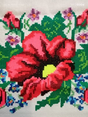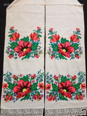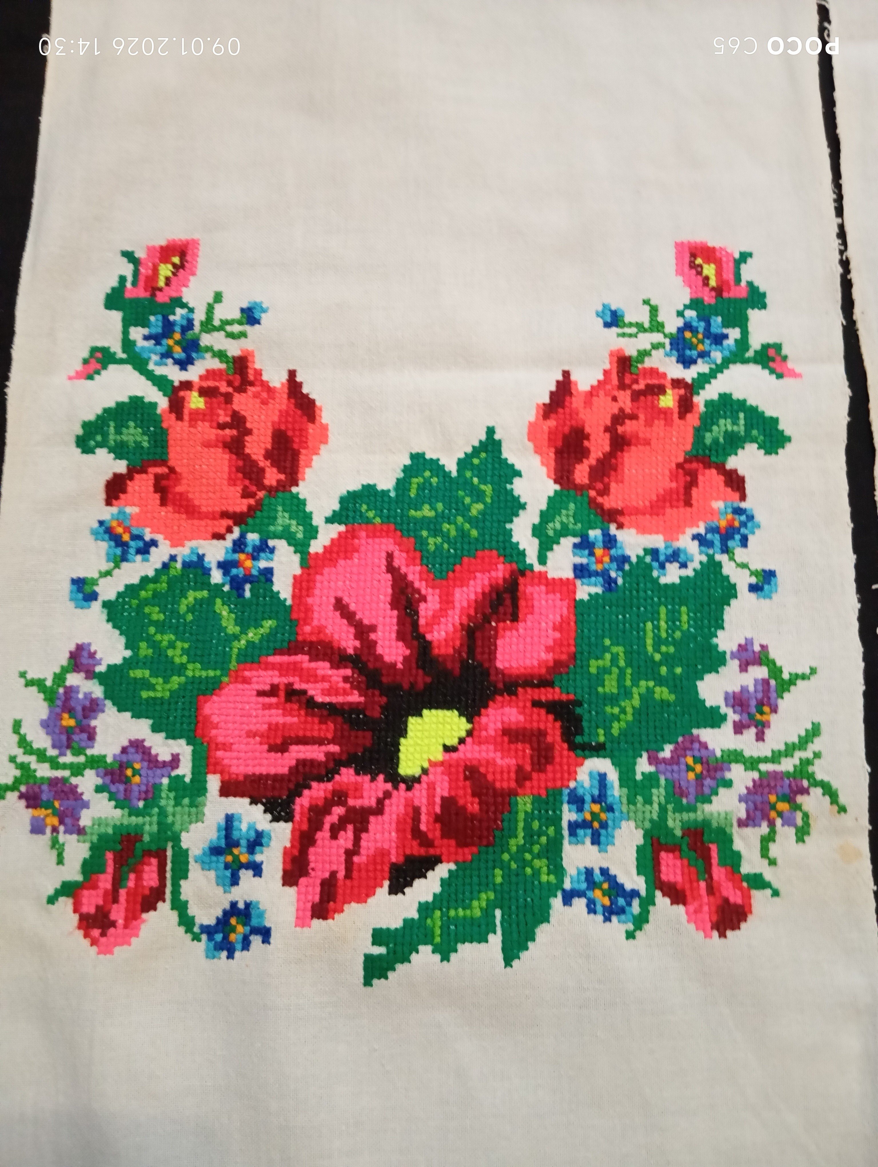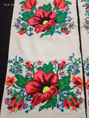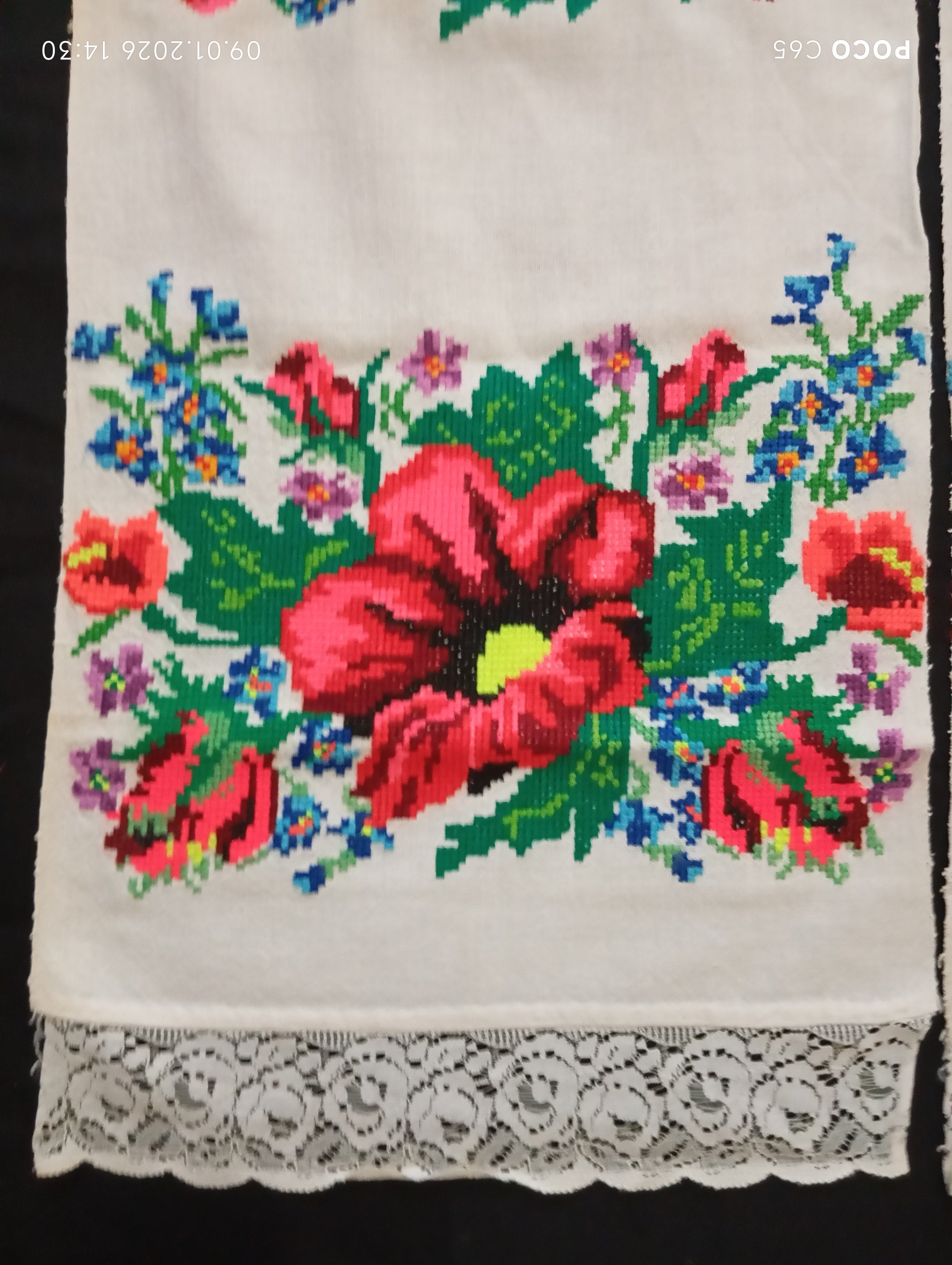 Рушник вишитий хрестиком на домотканому полотні. Вишивала Терещук Ніна Михайлівна, жителька села Деревок, орієнтовно у 1990-1995 рр.