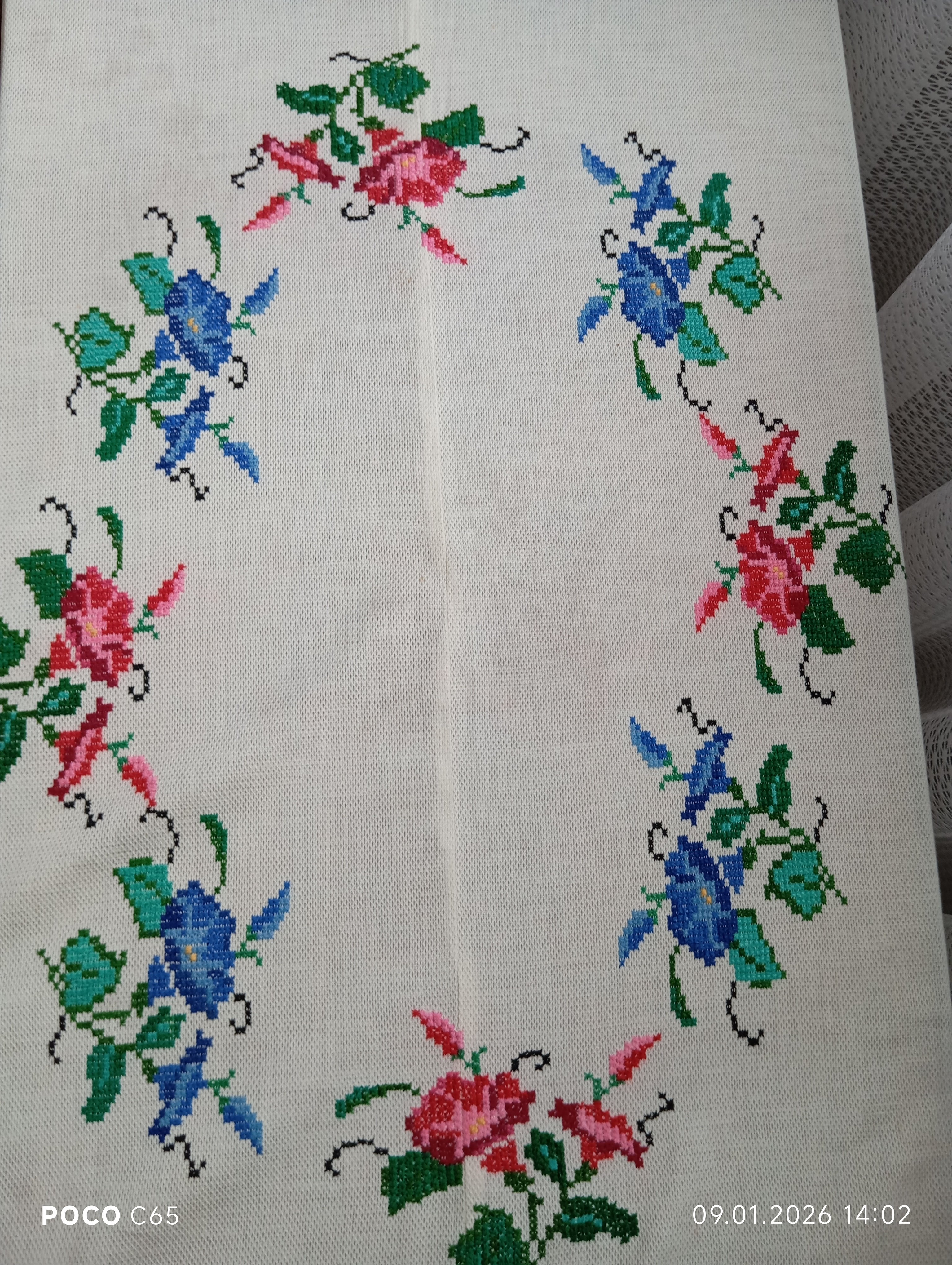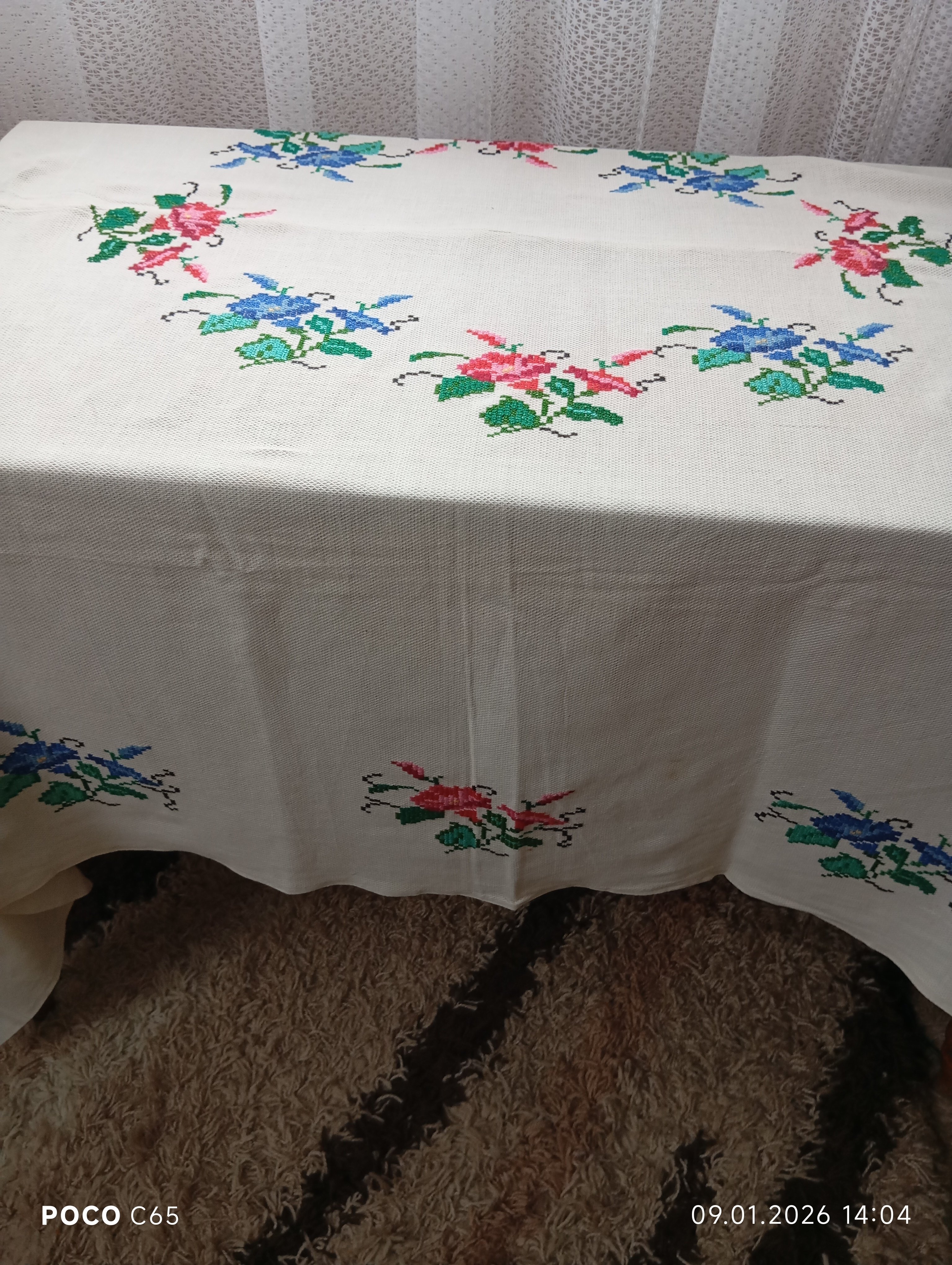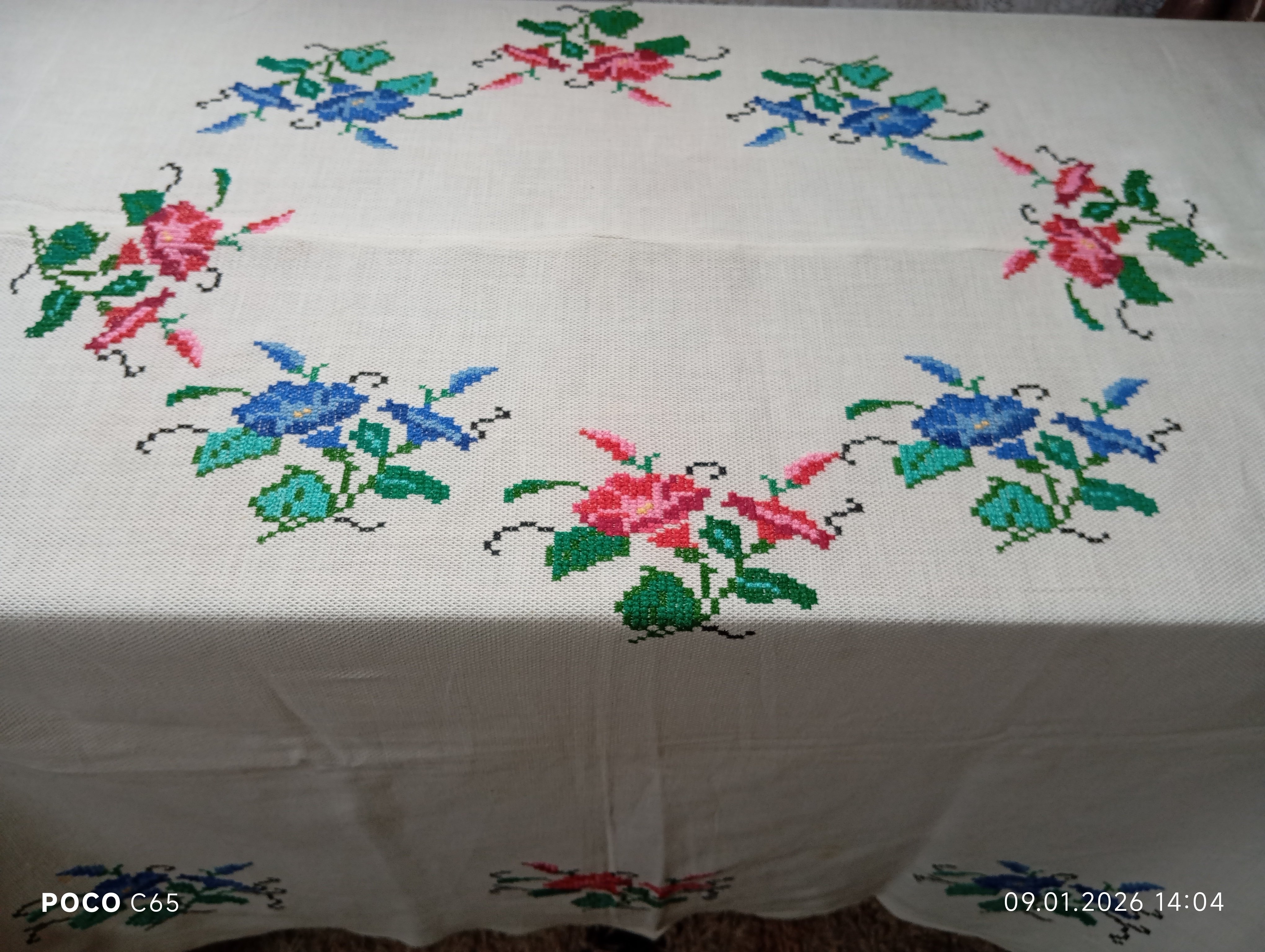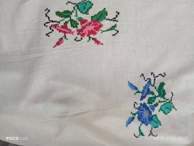 Скатертина вишита в техніці "французький хрестик" на купленій тканині, не призначеній для вишивання ( схоже на акрил). Вишивала Поліковська Катерина Іванівна 1925 року народження, жителька села Деревок, уродженка хутора Голівка, що біля Деревка.