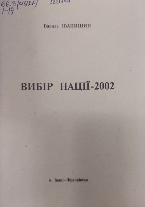 ...ації-2002 василь іванишин 323(477) 2002 -1 івано-франківська обласна друкарня іванишин в. вибір нації-2002 / василь іванишин.- івано-франківськ: [івано-франківська обл. друкарня], 2002.- 40 c. у вида...
